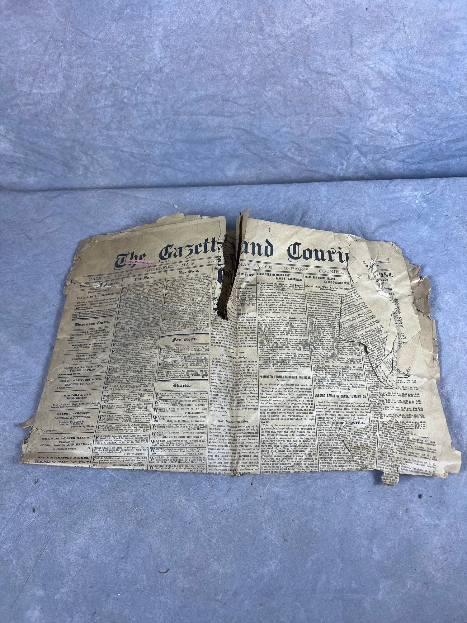 Greenfield, Massachusetts, The Gazette And Courier Newspaper, May 20th 1905, torn and crinkled in areas