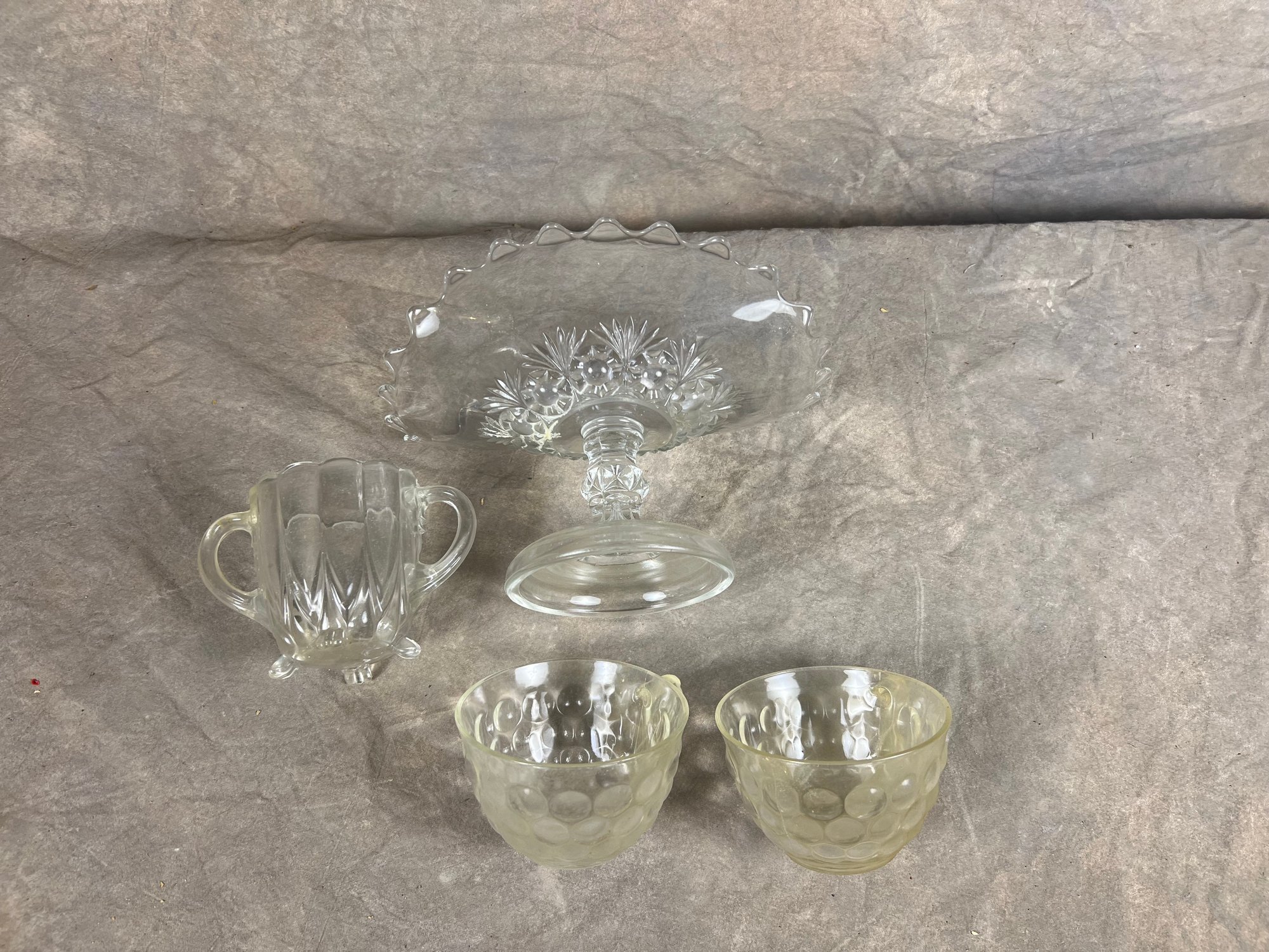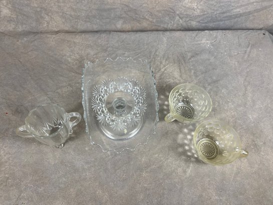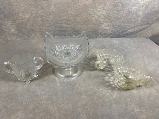 Group Of Four Pressed Glass Items, Glass Compote And Cups, in good condition
