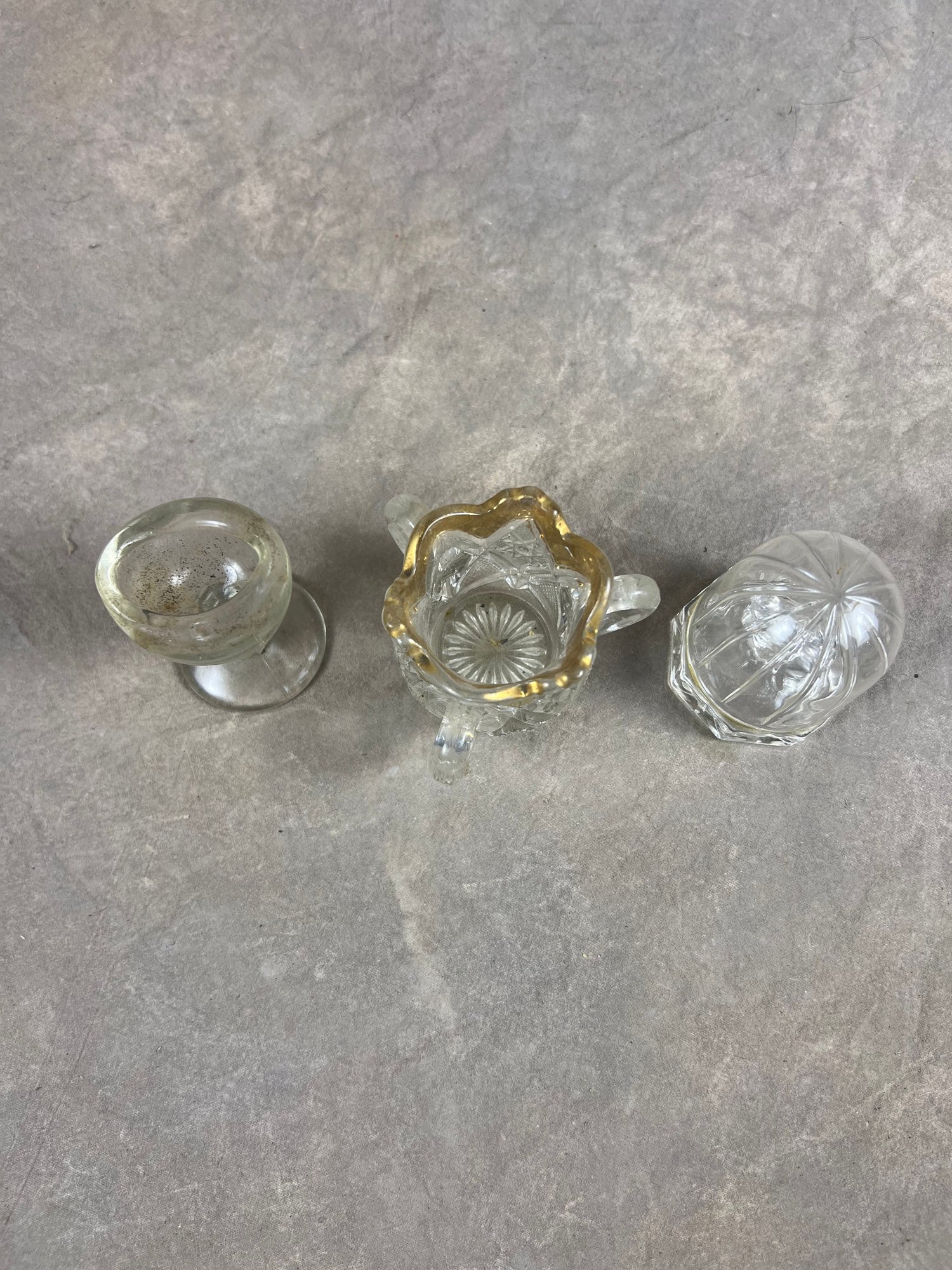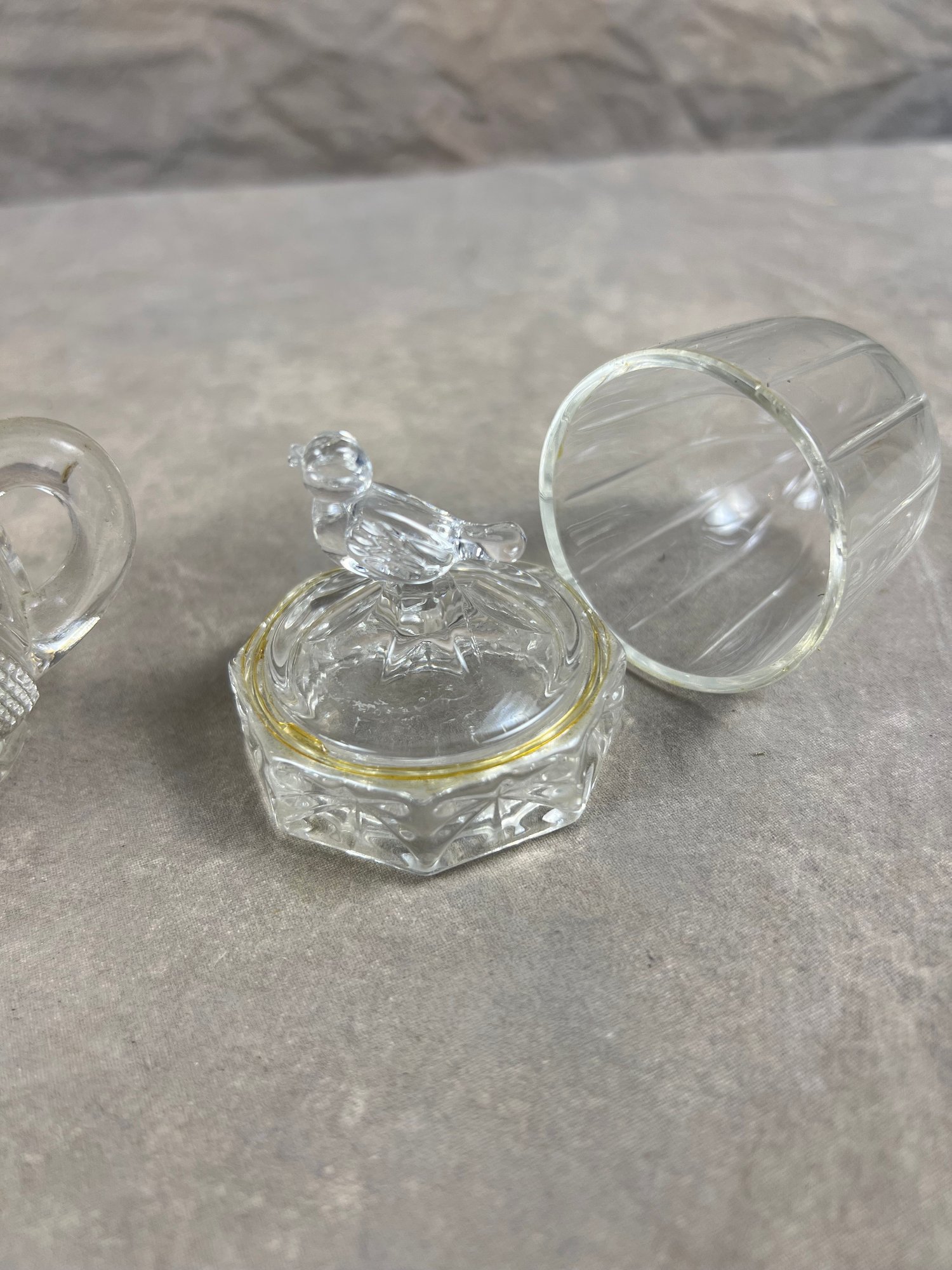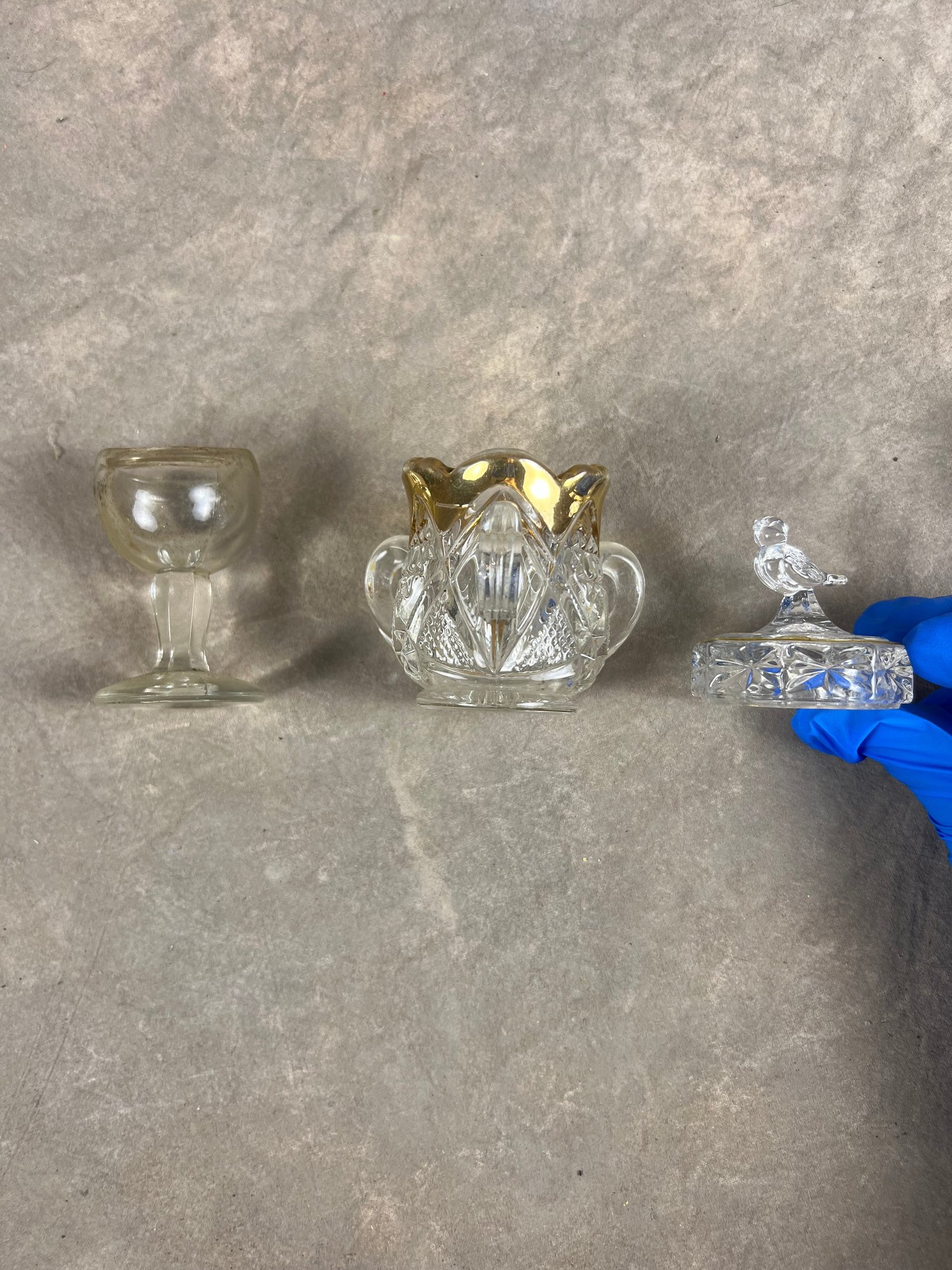 Group Of Three Mini Glass Items, Cups And Covered Bird Trinket, collectors items, in good conditions, requires individual cleanings