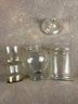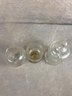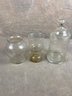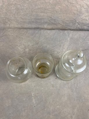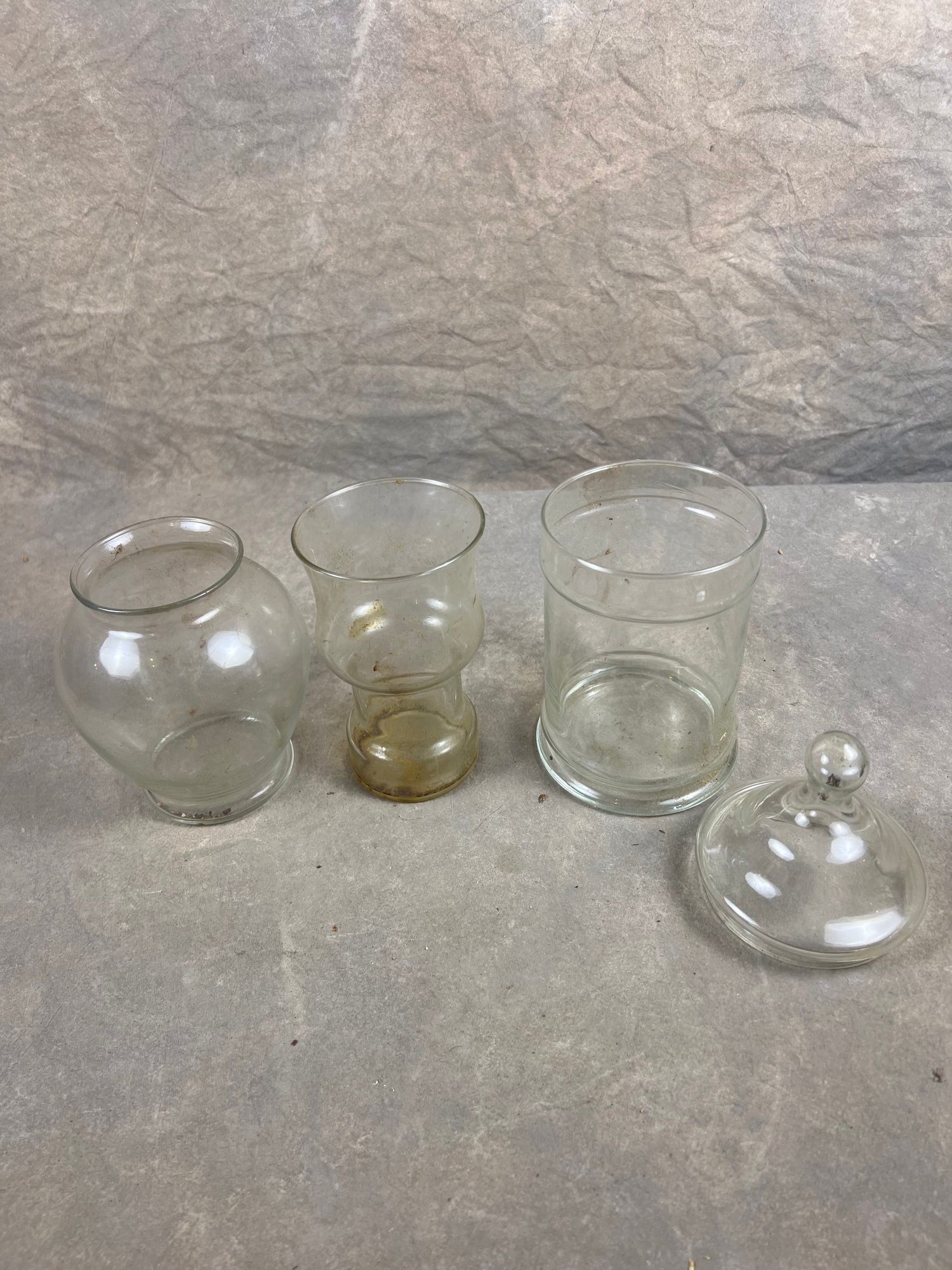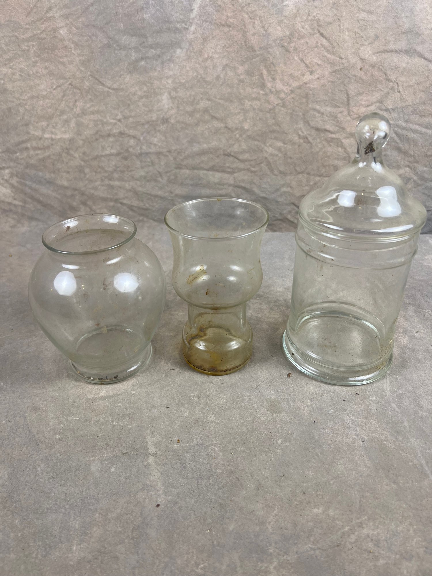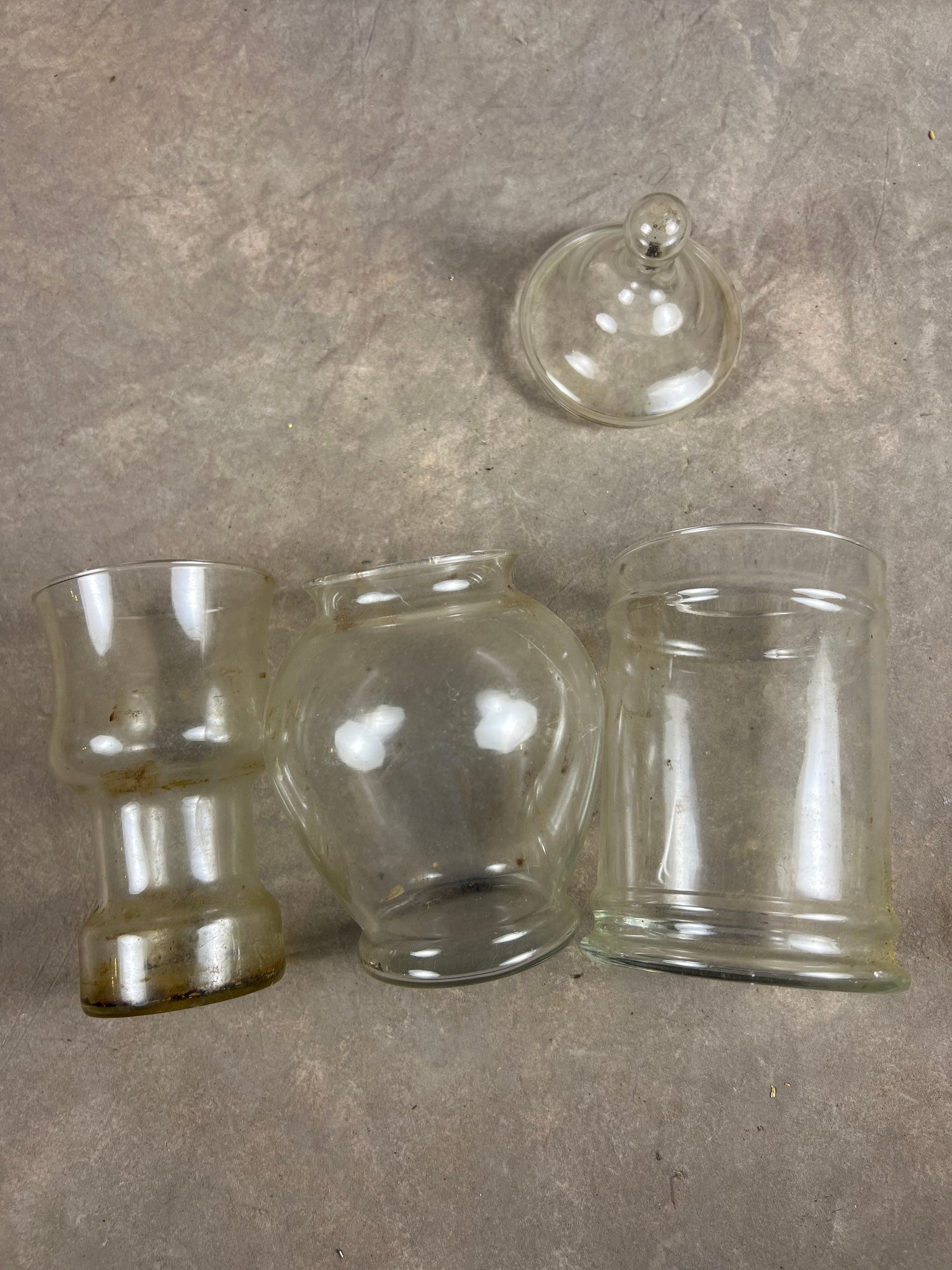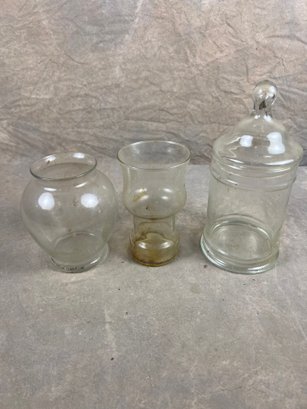 Group Of Three Vintage Clear Glass Apothecary Jars, one with lid, in good condition