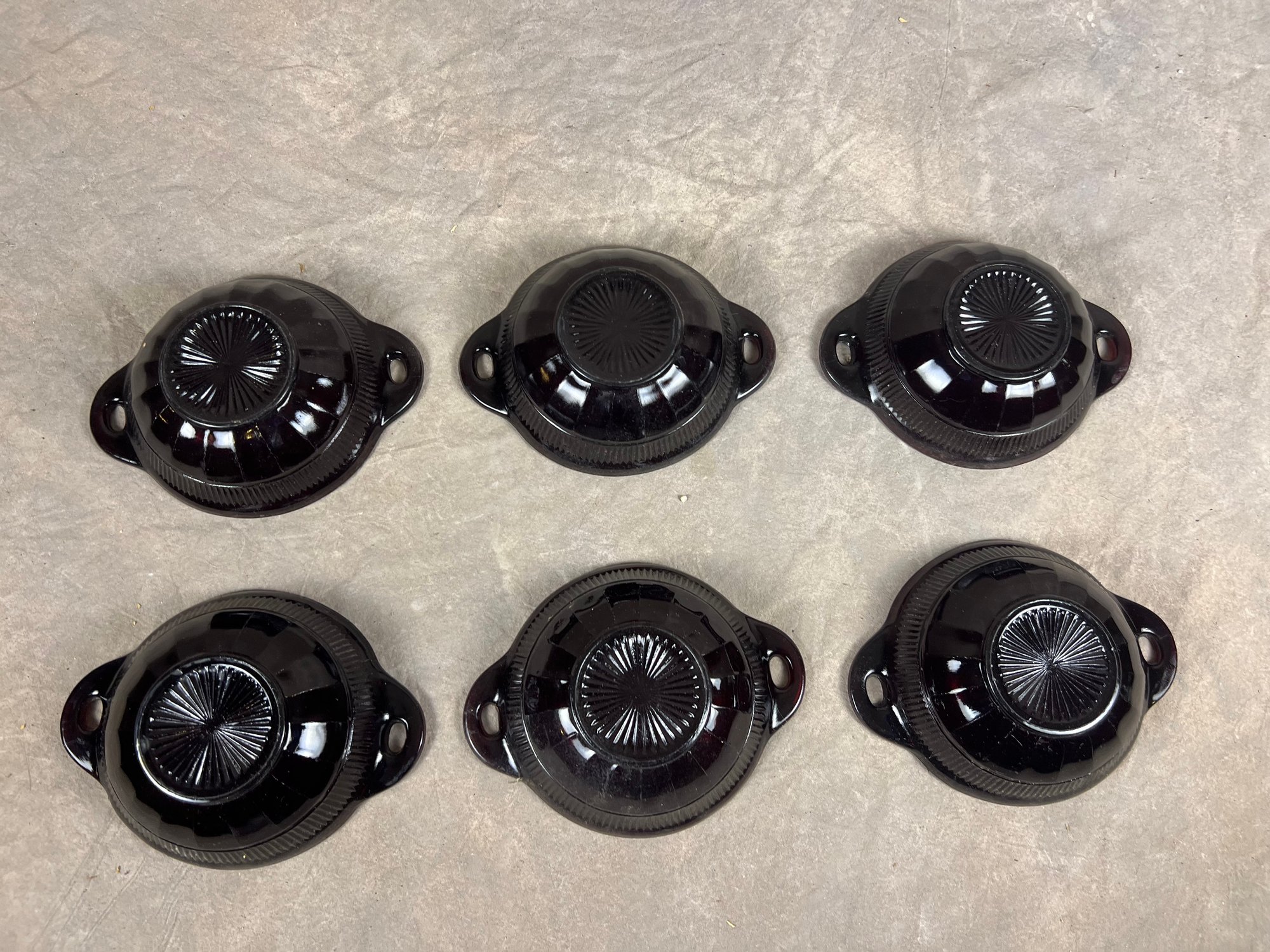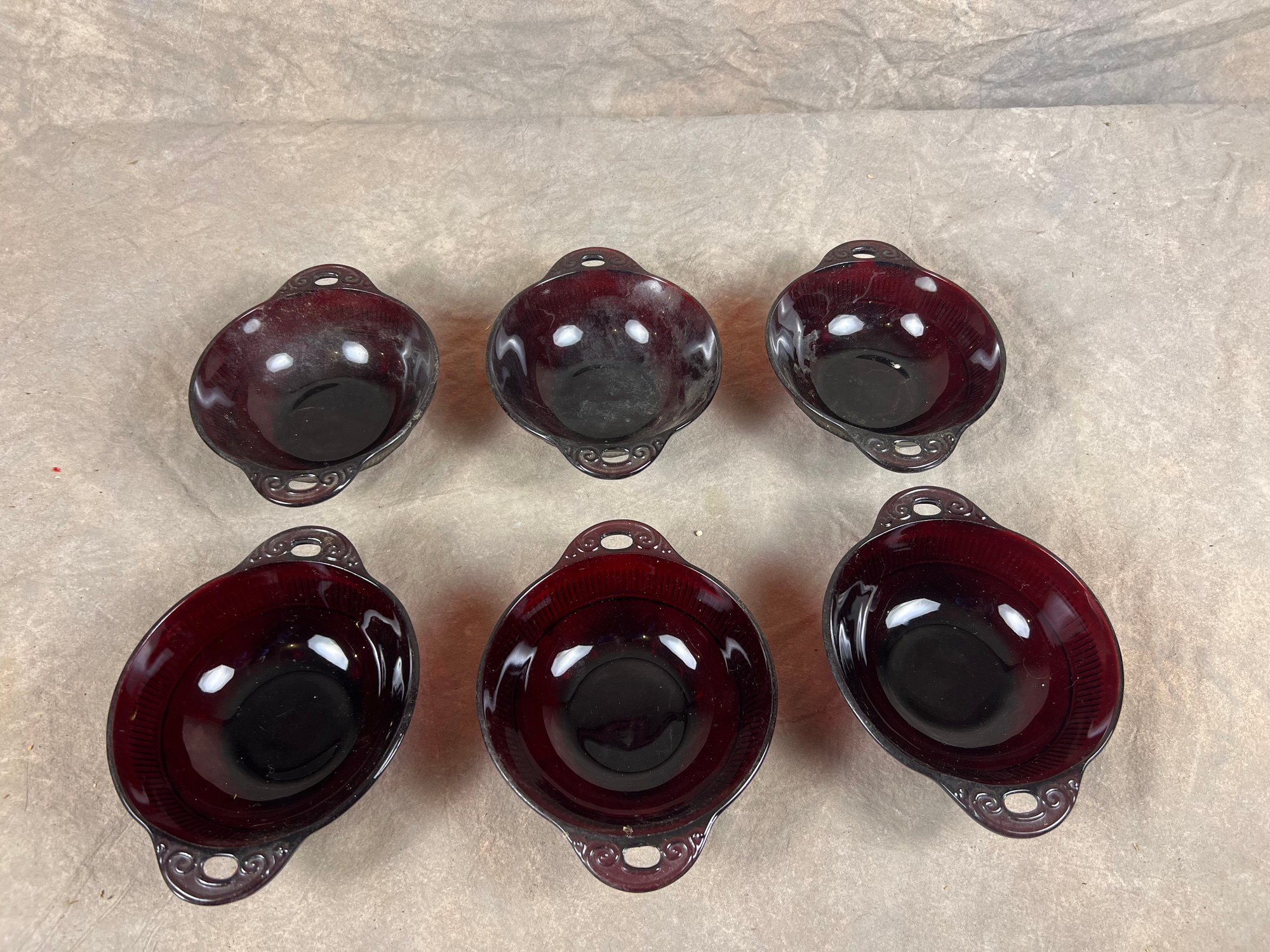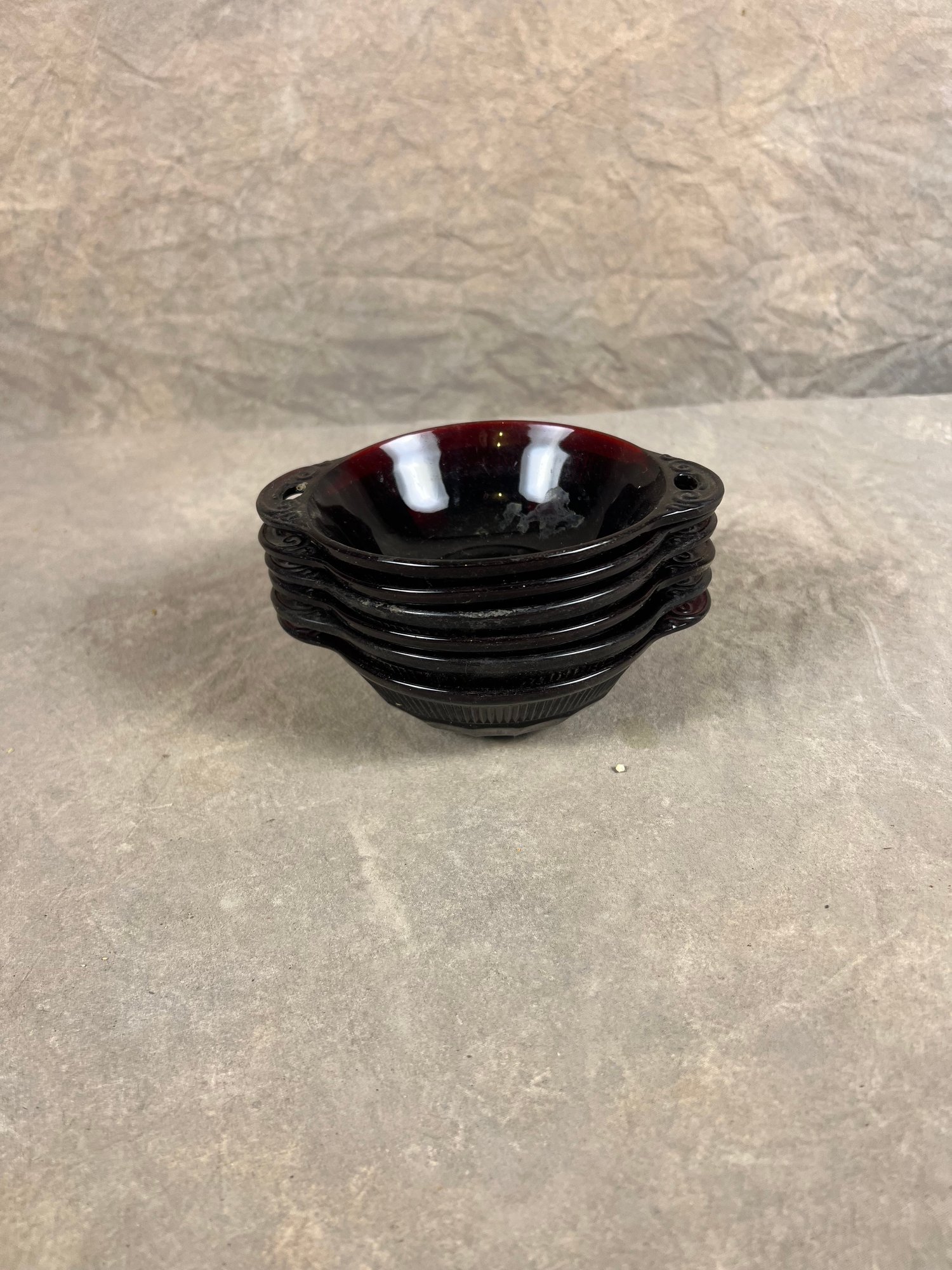Set Of Six Ruby Red Glass Berry Bowls With Handles, in good conditions, requires individual cleanings