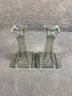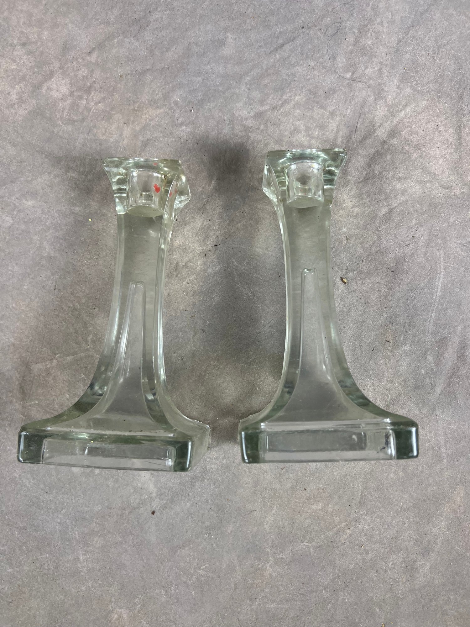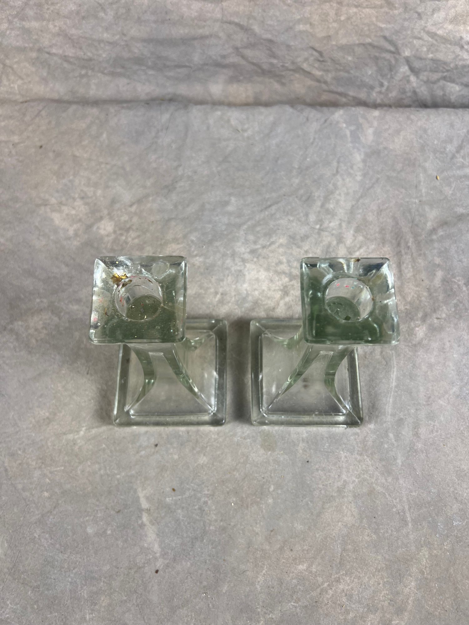 Set Of Two Clear Crystal Square Base Candlestick Holders, in good condition, mid 20th century