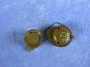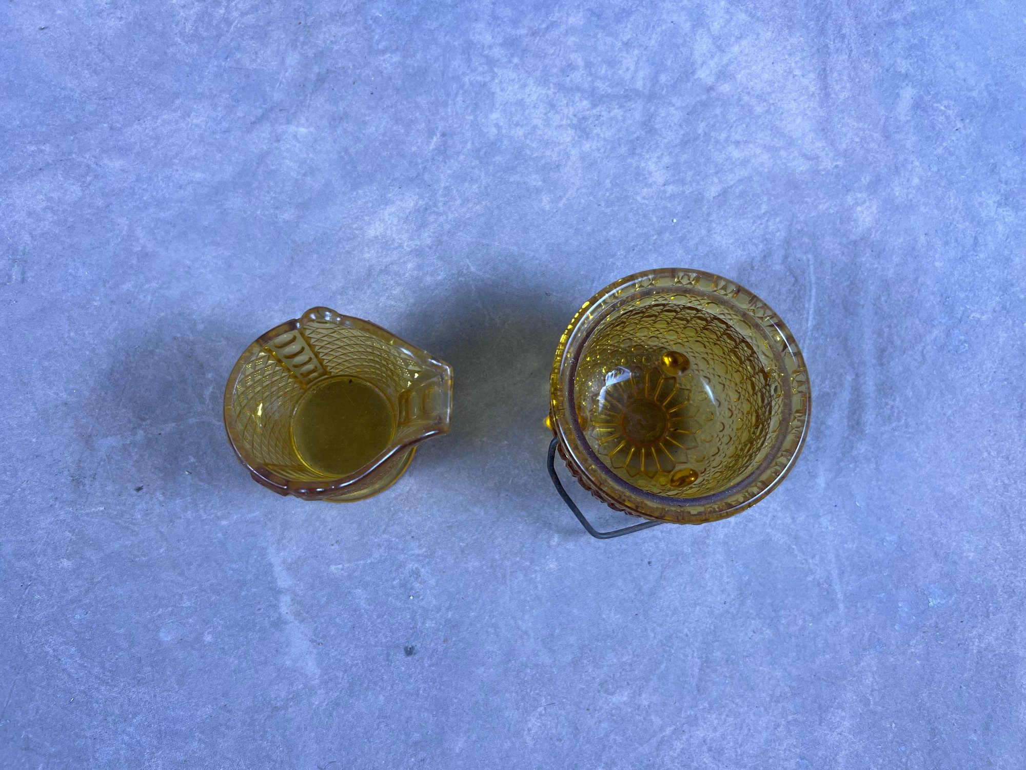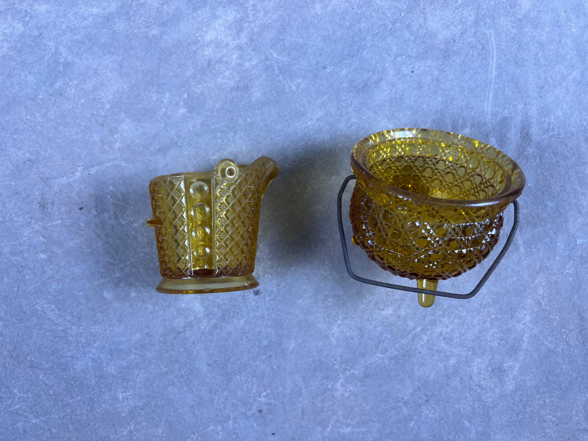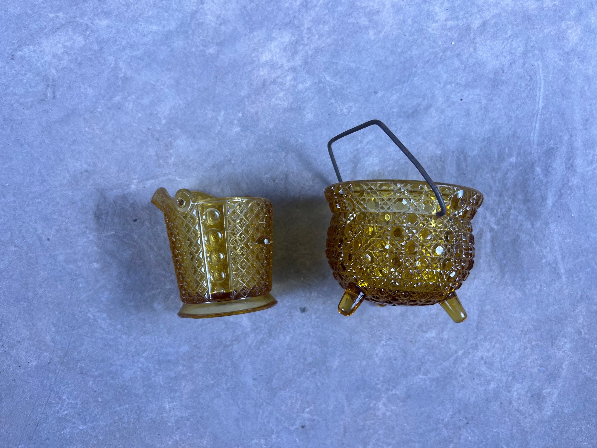 Small Vintage Yellow Glass Daisy Button Pattern Cauldron And Creamer, creamer is missing its handle, otherwise both in good condition