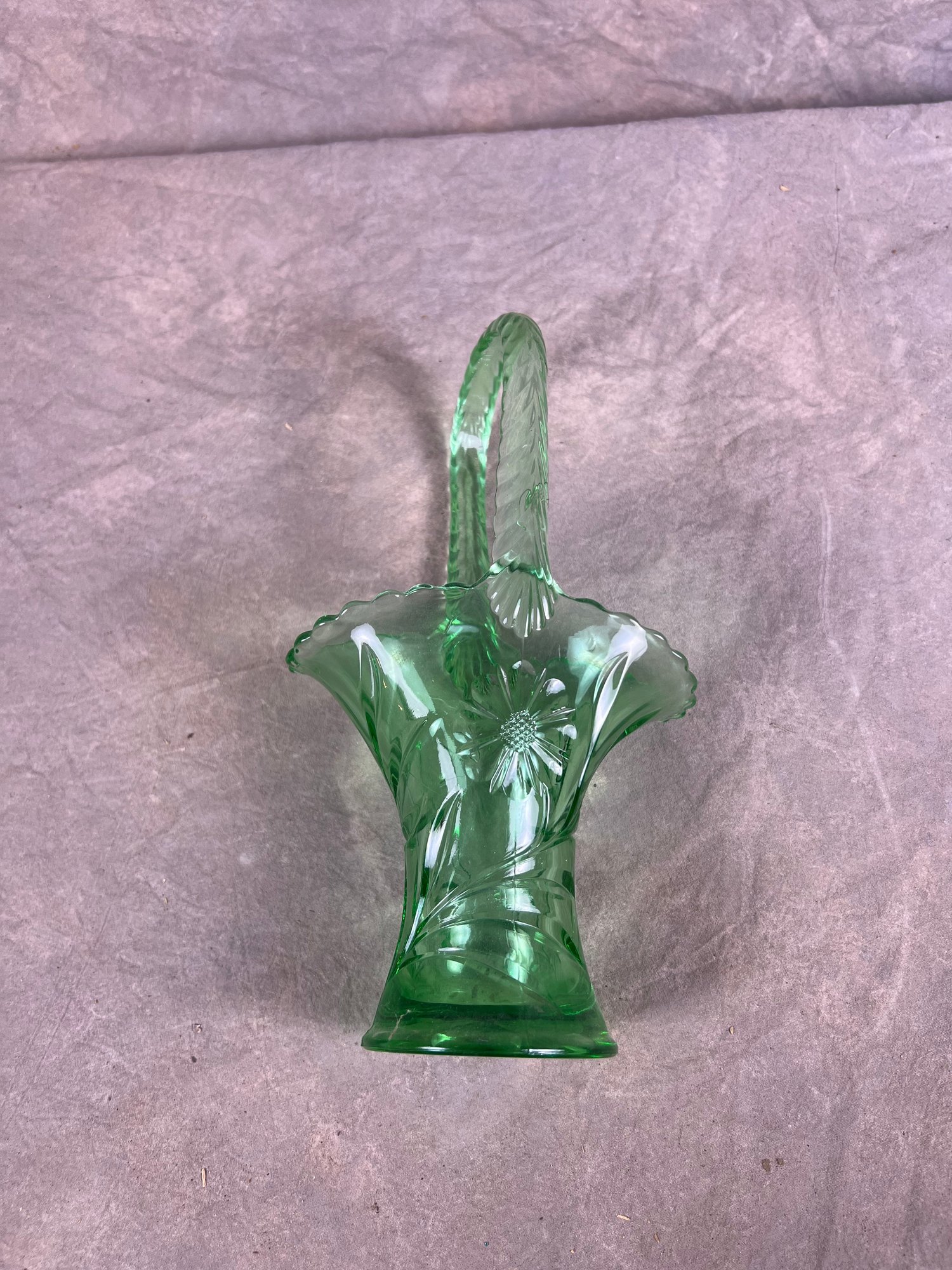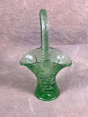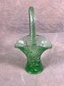 Vintage Green Depression Glass Basket With Braided Handle, in good condition, floral details on side.