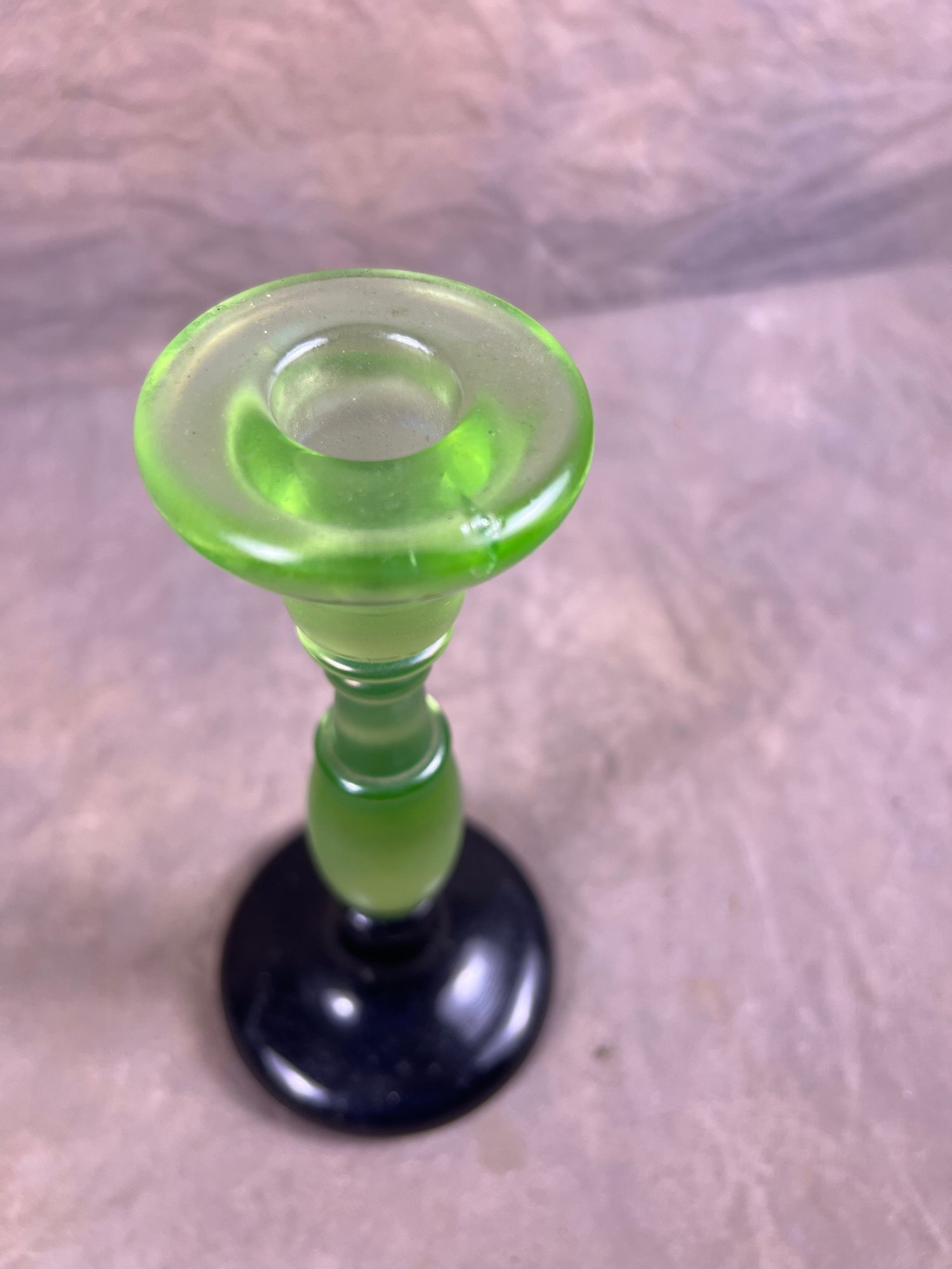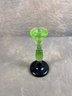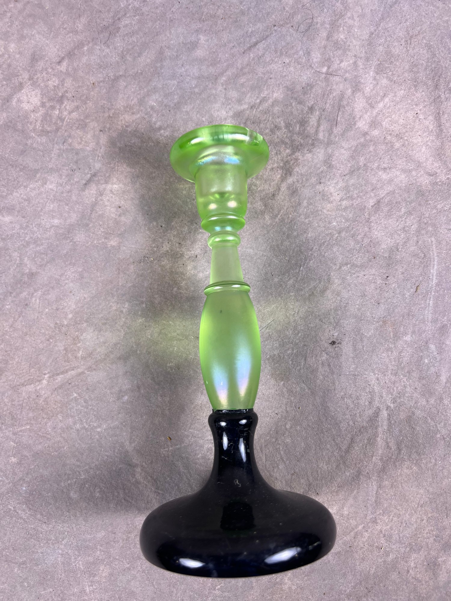Vintage Green Vaseline Uranium Glass Candlestick Holder With Black Base, small crack in top, as seen in picture