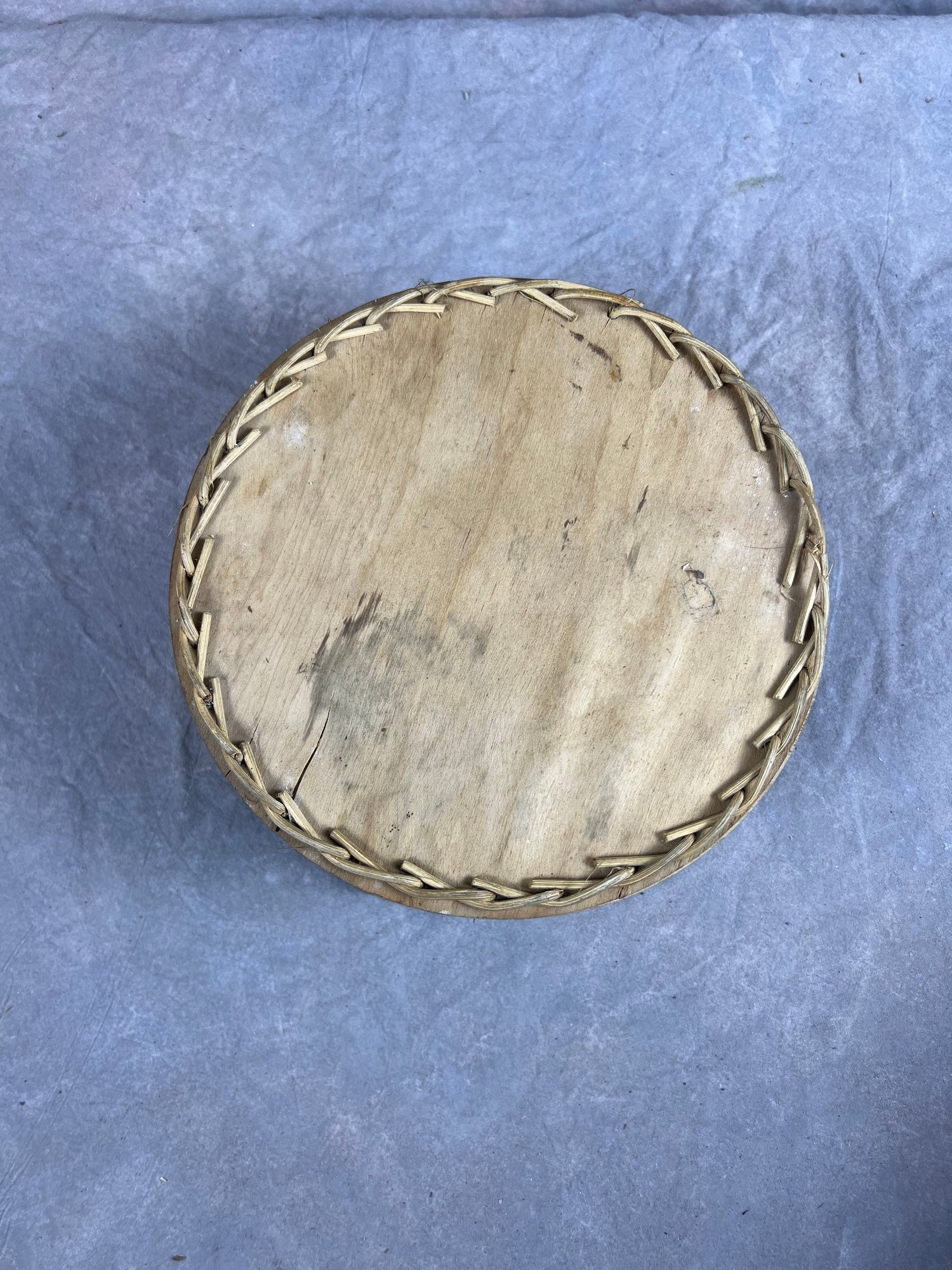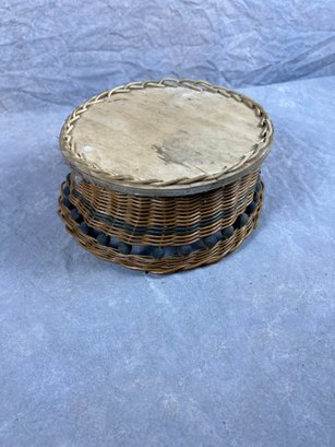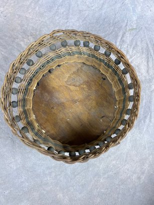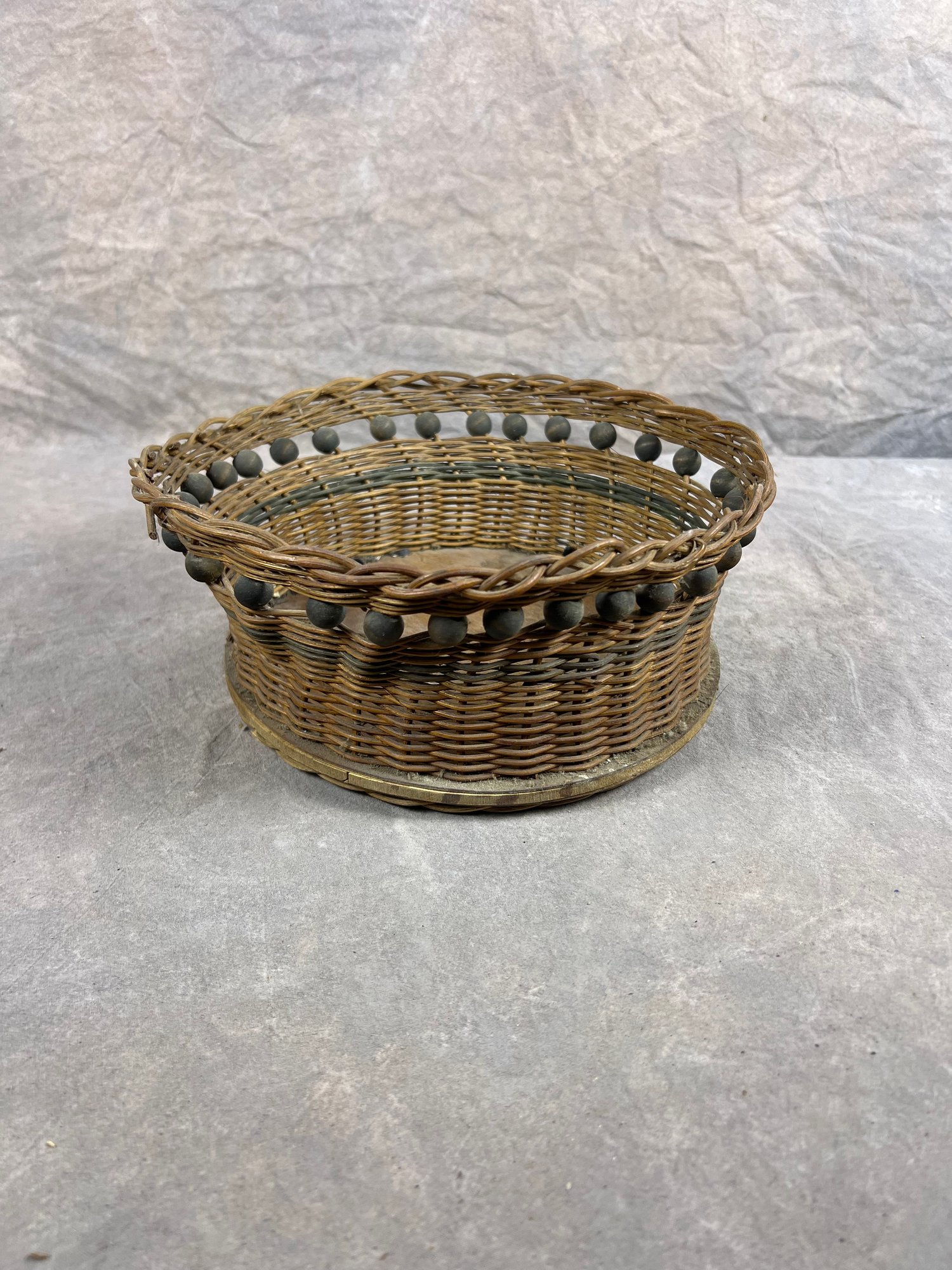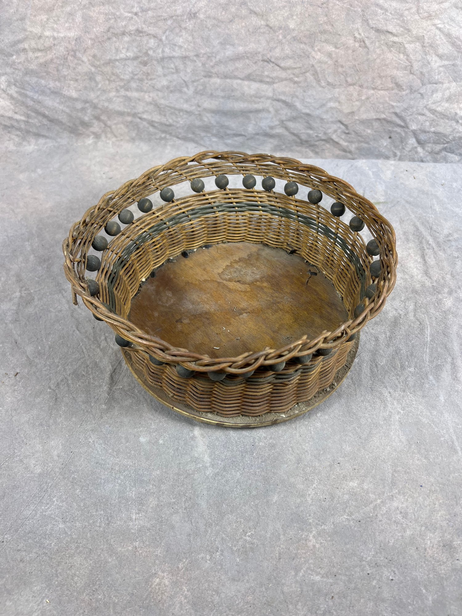 Vintage Woven Wicker Basket With Wooden Base And Beaded Rim, in good condition
