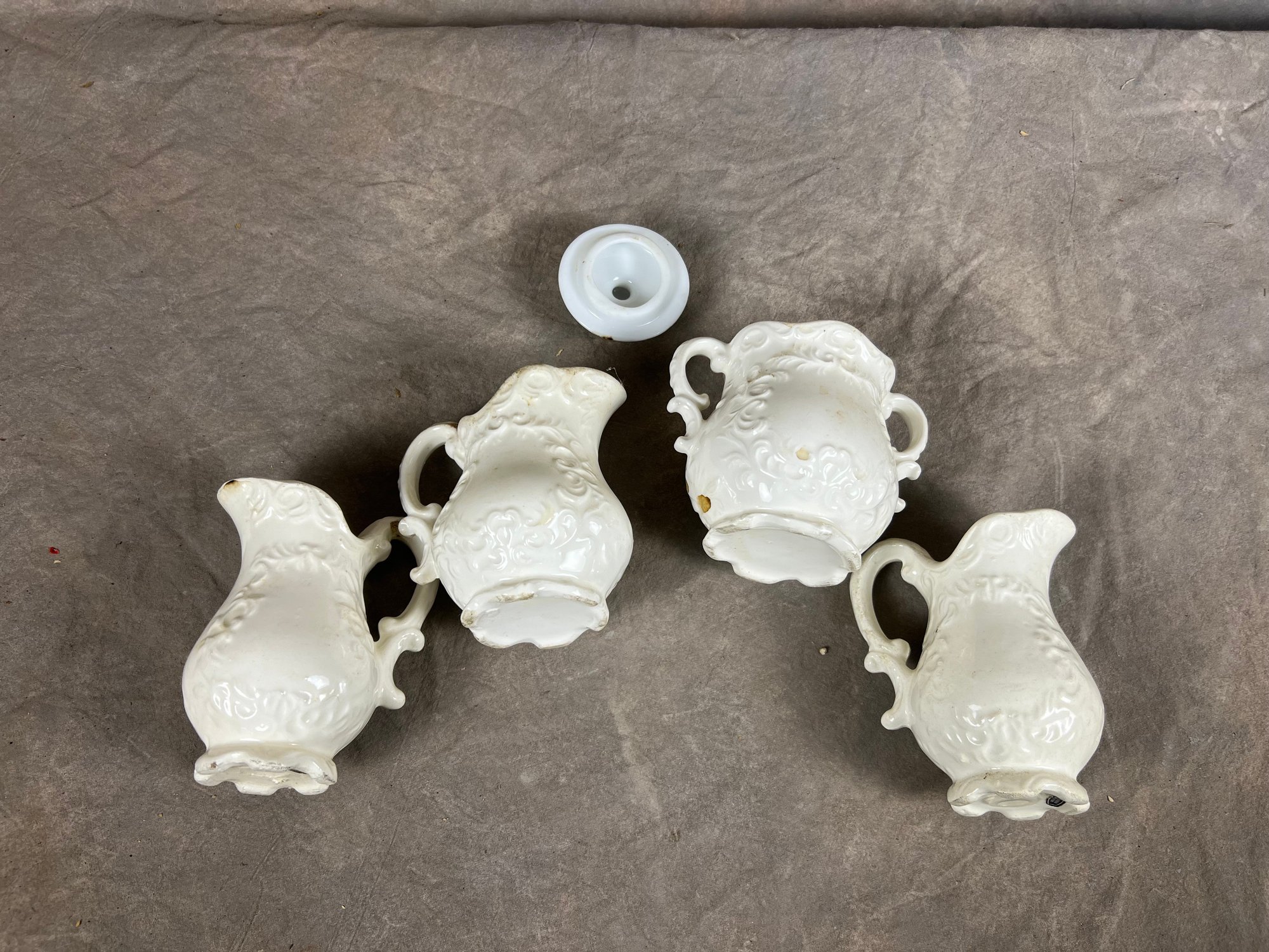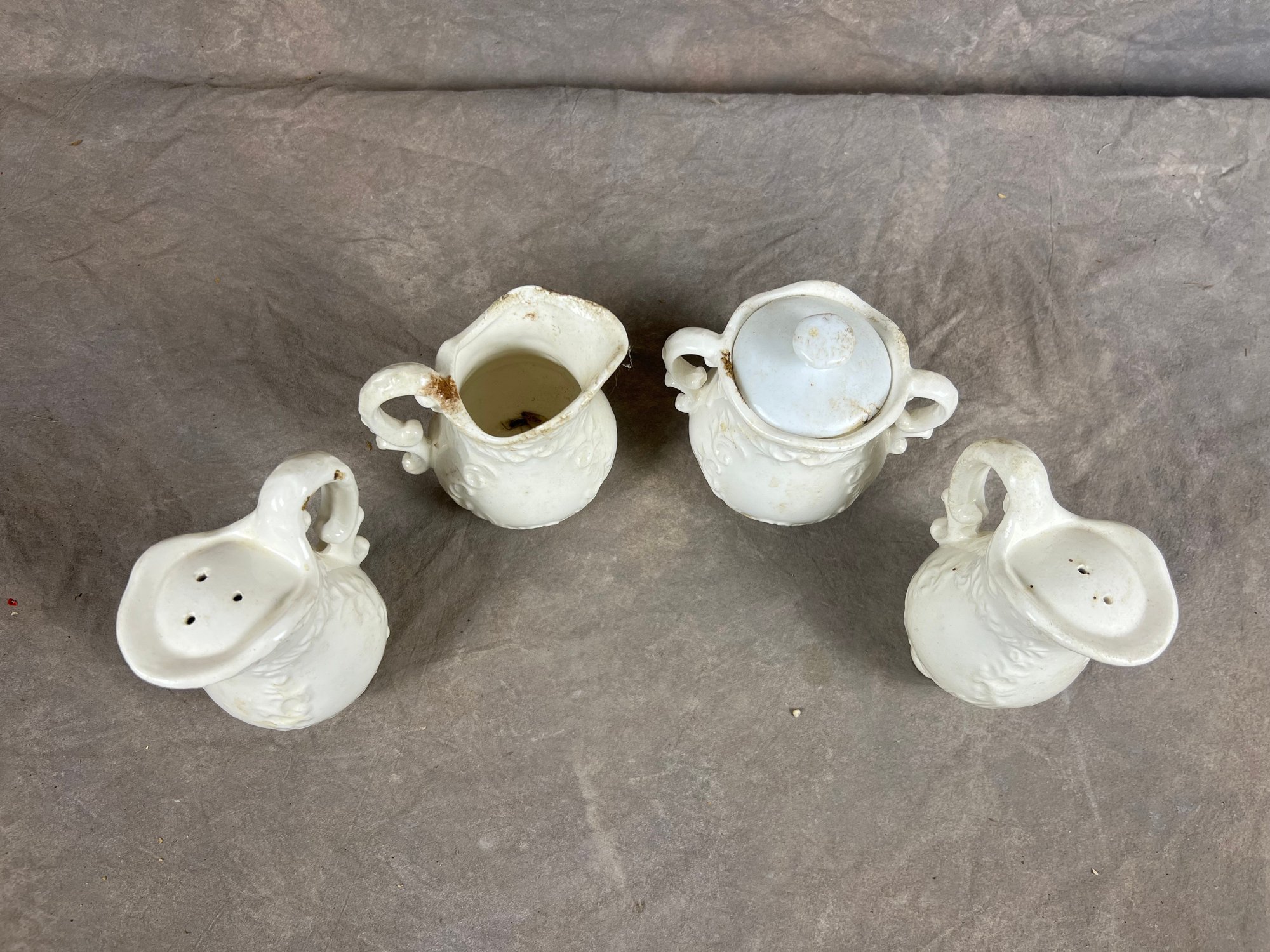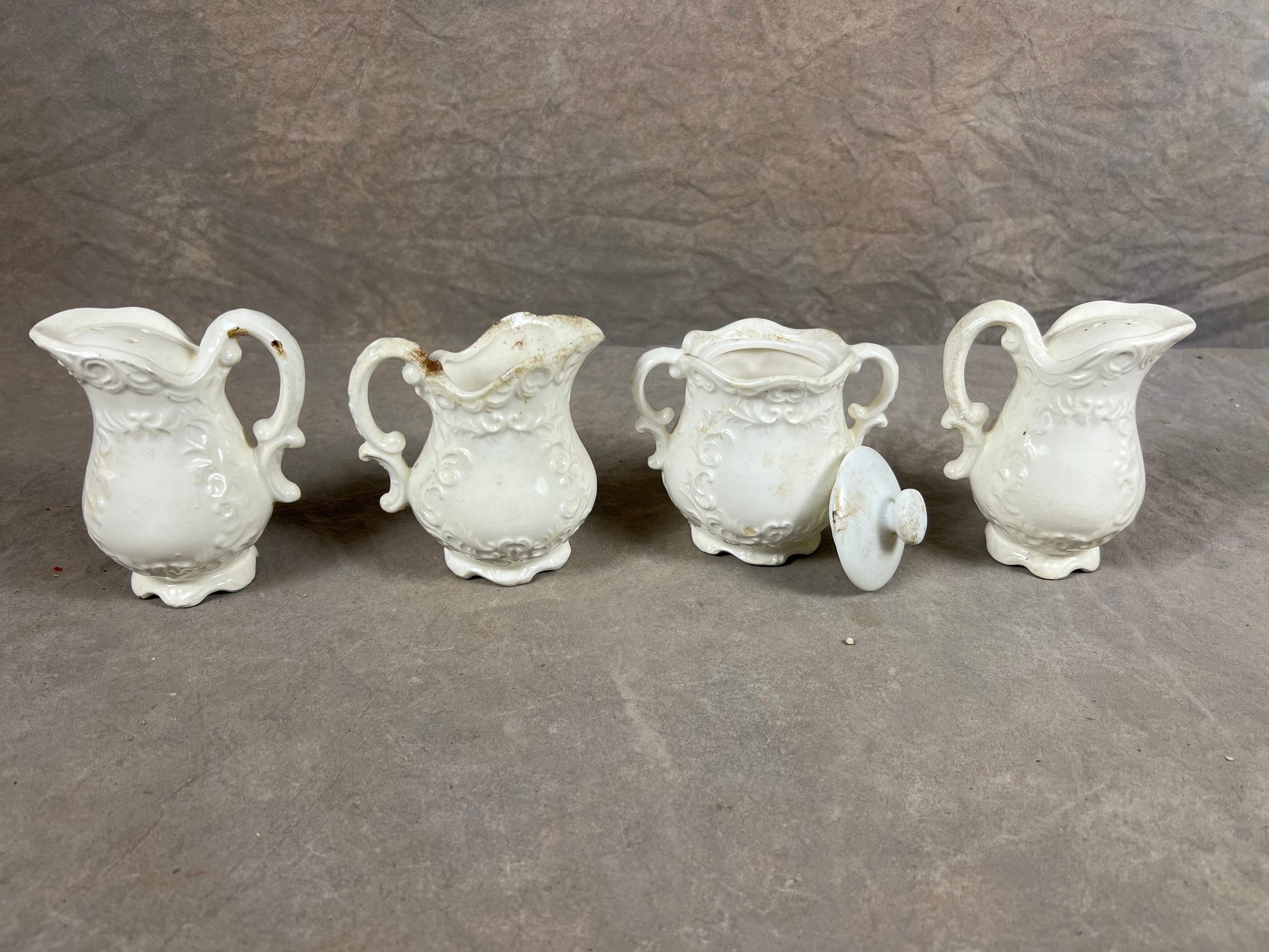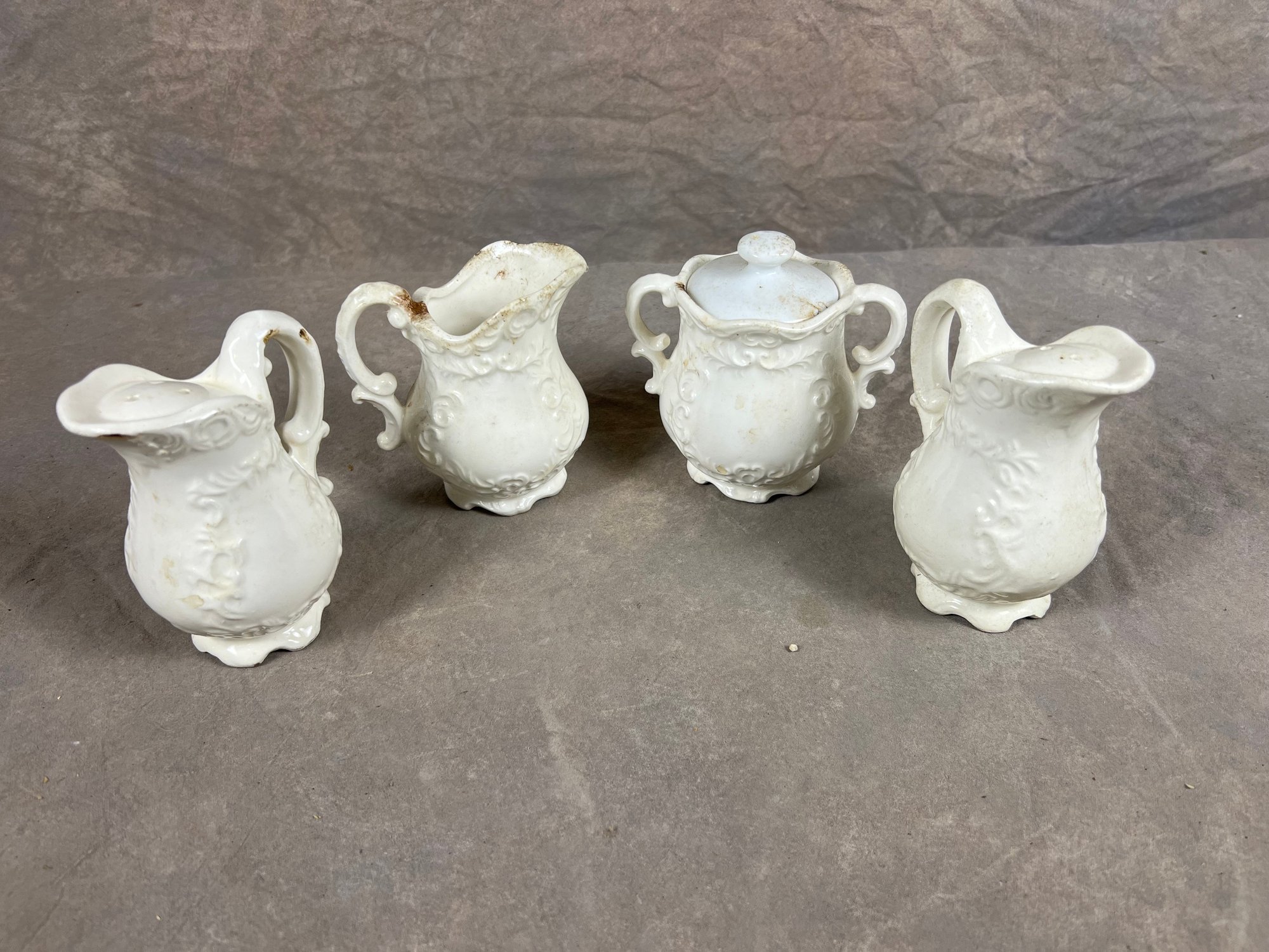 White Porcelain Pitcher And Sugar Bowl Set With Embossed Floral Design, in good conditions, requires individual cleanings.