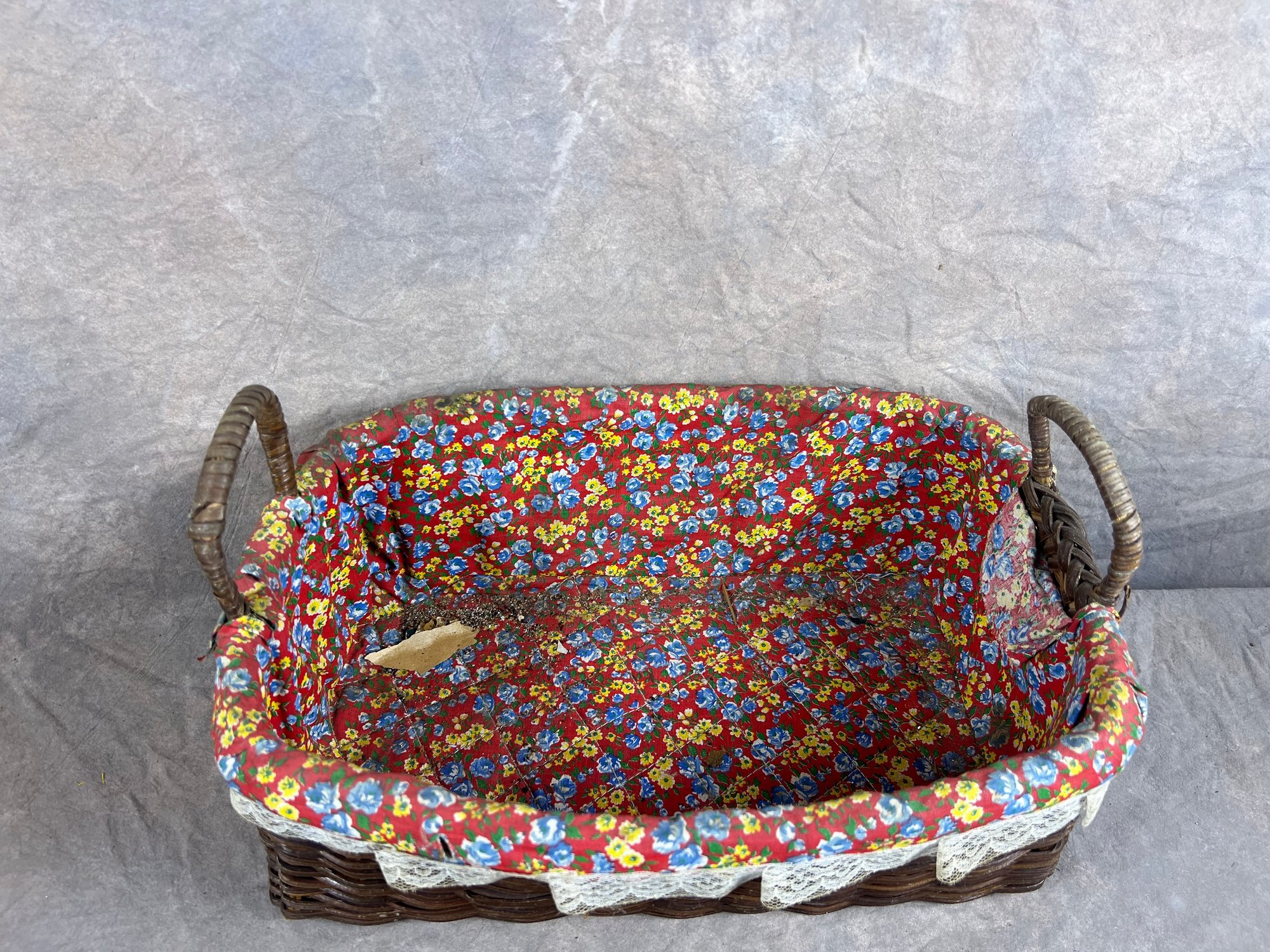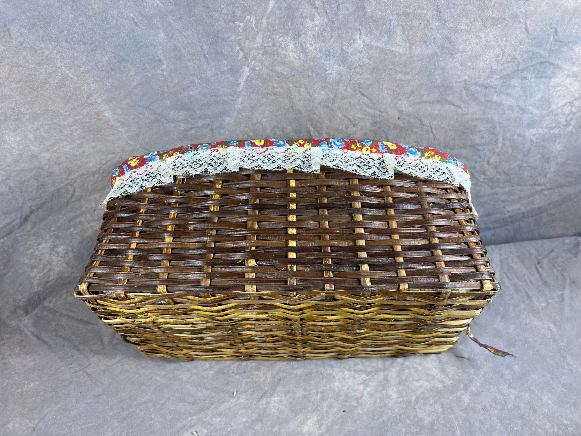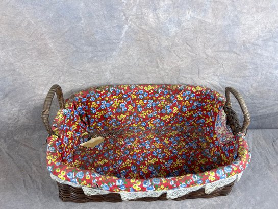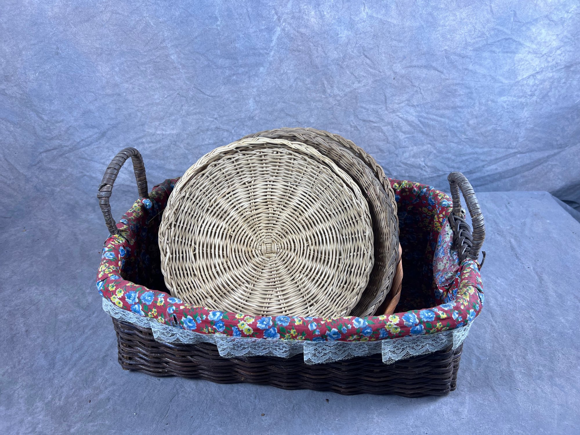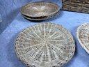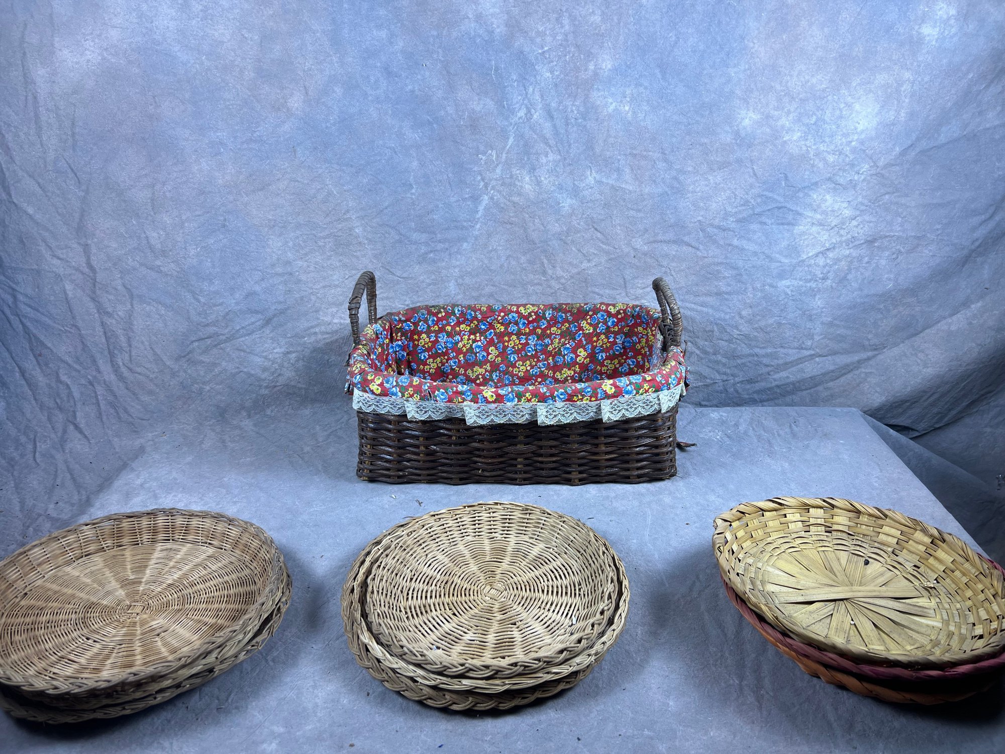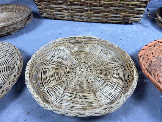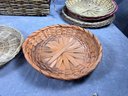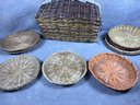 Woven Basket Collection, Floral Lined Basket And Nine Colorful Woven Plate Baskets, late 20th century